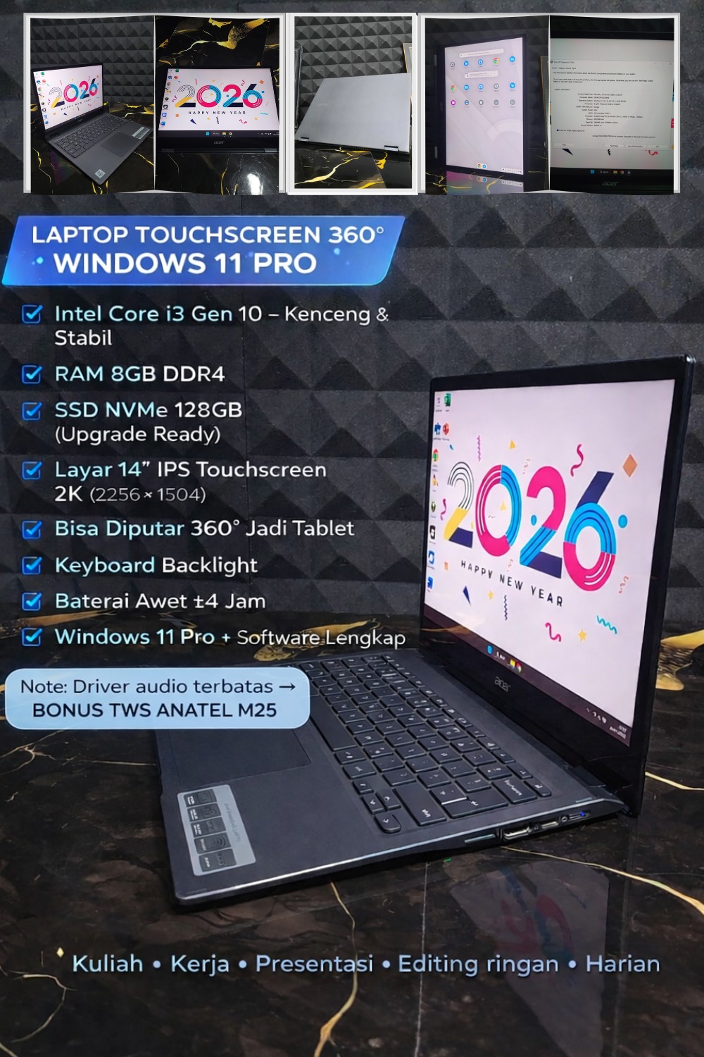 – Engsel 360° → bisa dilipat jadi tablet