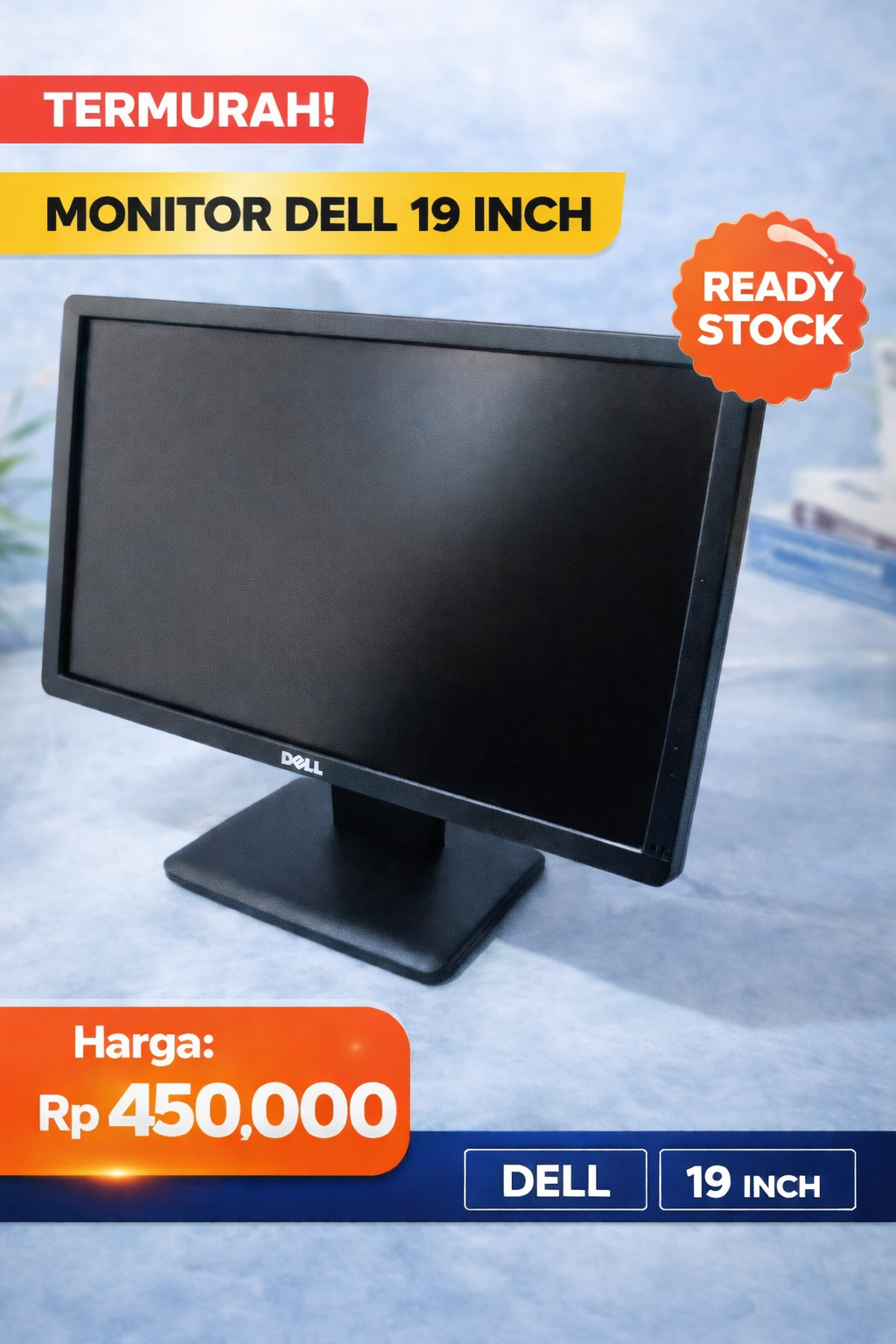 Monitor layar 19 inci dengan tampilan jernih dan stabil. Cocok untuk kantor, kasir, sekolah, warnet, dan penggunaan harian.